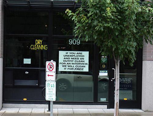 …Αυτή η πινακίδα σε ένα καταπληκτικό στεγνοκαθαριστήριο. (*) Γράφει «αν είσαι άνεργος και χρειάζεσαι καθαρά ρούχα για να πας σε συνέντευξη, σ’ τα καθαρίζουμε δωρεάν».