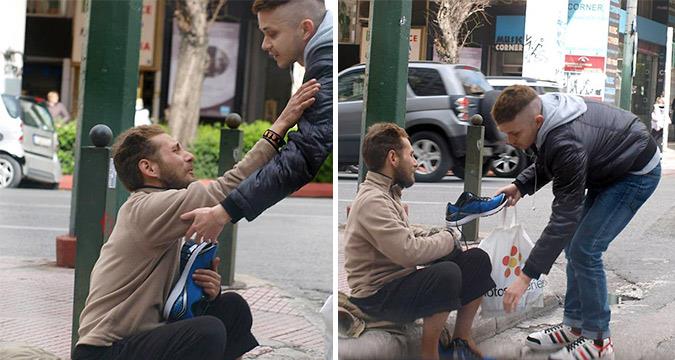 Ένας νεαρός προσέφερε παπούτσια σε έναν άστεγο στην Πανεπιστημίου και εκείνος δάκρυσε από συγκίνηση. Τη στιγμή απαθανάτισε ο φωτογραφικός φακός περαστικού.
