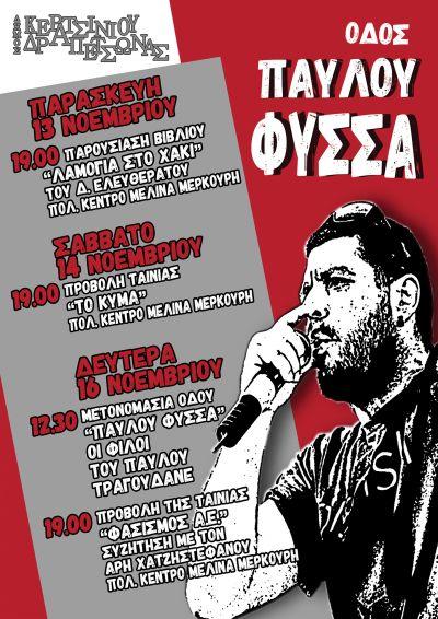 Οι κάτοικοι της περιοχής εδώ και ένα χρόνο είχαν ήδη αναρτήσει ταμπέλα με την επιγραφή «οδός αντιφασίστα Παύλου Φύσσα» στην περιοχή, αλλά τώρα γίνεται και επισήμως η μετονομασία. Ο εορτασμός θα ξεκινήσει σήμερα Παρασκευή 13/11 στις 19.00 με παρουσίαση του βιβλίου «Λαμόγια στο χακί», θα συνεχιστεί το Σάββατο με προβολή της ταινίας «Το Κύμα» στο πολιτιστικό κέντρο Μελίνα Μερκούρη και θα ολοκληρωθεί τη Δευτέρα με τους φίλους του Παύλου να τραγουδούν ζωντανά κατά την μετονομασία της οδού στις 12.30 και με την προβολή της ταινίας Φασισμός ΑΕ στις 19.00 Δείτε τις εκδηλώσεις αναλυτικά στην παρακάτω αφίσα.
