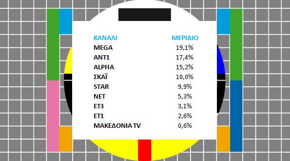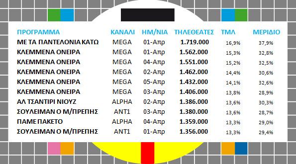 *Τα νούμερα της εβδομάδας Τα κορυφαία σε τηλεθέαση προγράμματα για την εβδομάδα 1-6 Απριλίου Τα μερίδια των τηλεοπτικών σταθμών Πηγή: NIELSEN AUDIENCE MEASUREMENT