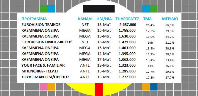 Τα καλύτερα, τα χειρότερα και τα παραλειπόμενα της φετινής Eurovision, μαζί με τα καυτά ντόπια νέα και τα τηλεοπτικά νούμερα της εβδομάδας.