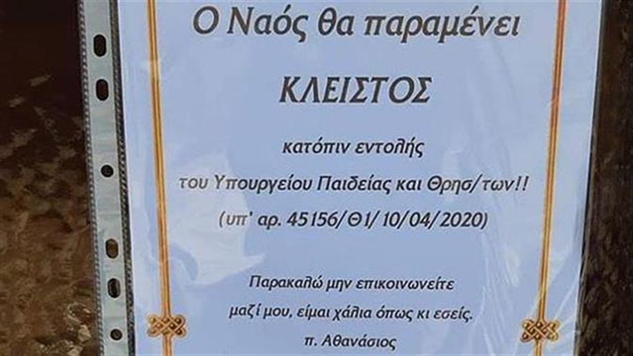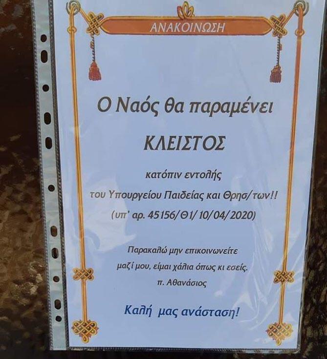 Δείτε, για παράδειγμα, τον Πατέρα Αθανάσιο, ο οποίος έγινε viral αναρτώντας την παρακάτω ανακοίνωση έξω από την πόρτα του ναού. Στην ανακοίνωση αναφέρεται πως κατόπιν εντολής του Υπουργείου ο ναός θα παραμείνει Κλειστός, όμως υπάρχει και κάτι ακόμα…