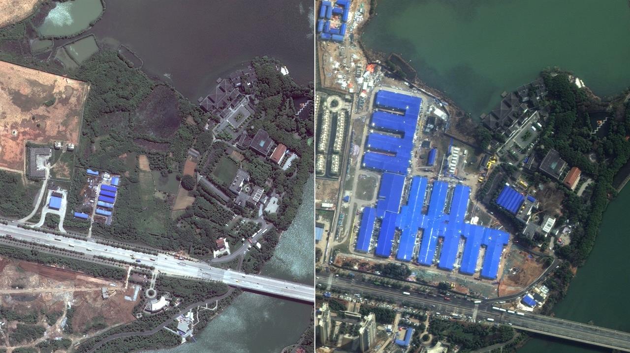 Το Νοσοκομείο Huoshensan στο Γουχάν της Κίνας το 2017 (αριστερά). Το νοσοκομείο που χτίστηκε το 2020 (δεξιά)