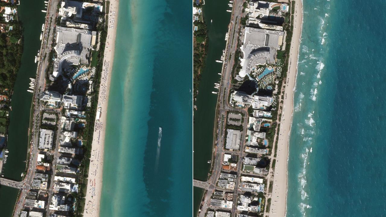 Η παραλία στο Μαϊάμι το 2019 (αριστερά). Η άδεια παραλία το 2020 (δεξιά).