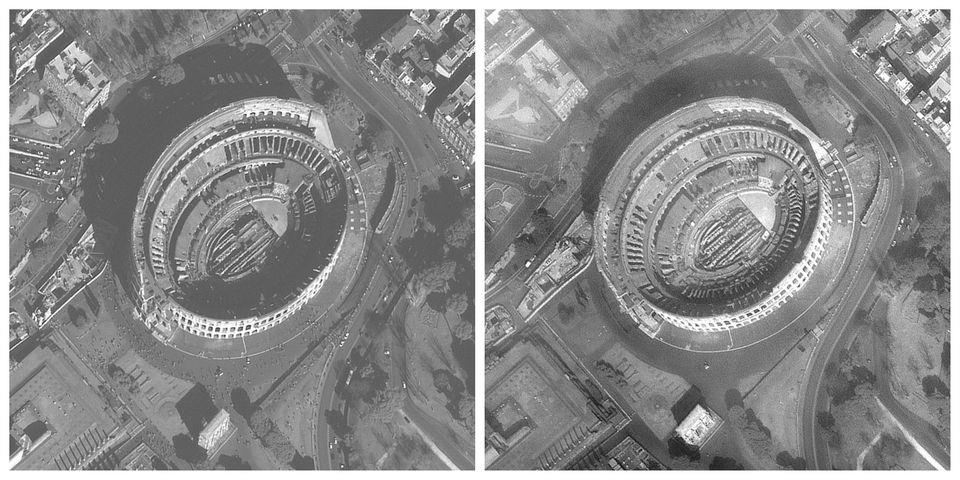 Οι τελευταίοι επισκέπτες στο Κολοσσαίο της Ρώμης τον Φεβρουάριο (αριστερά). Ένα μηνά μετά, το μνημείο ερημωμένο (δεξιά).