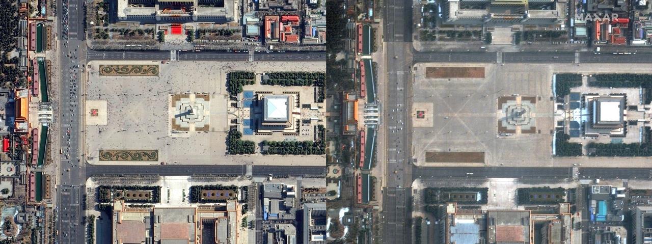 Η Πλατεία Τιενανμέν στο Πεκίνο στις 21 Φεβρουαρίου 2019 (αριστερά) και στις 11 Φεβρουαρίου 2020 (δεξιά).