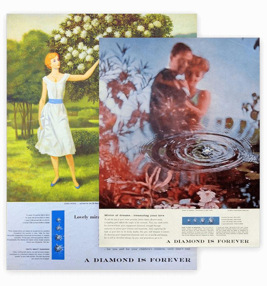 Για όλες εκείνες τις προτάσεις γάμου με μονόπετρα… ευθύνεται η εταιρεία De Beers. Μέχρι το 1938, η εν λόγω εταιρεία εξόρυξης και παραγωγής διαμαντιών, ζοριζόταν να πουλήσει τους πολύτιμους λίθους της. Οι πωλήσεις αυξήθηκαν για δύο δεκαετίες, αλλά μόλις χτύπησε η Μεγάλη Ύφεση, λίγοι ήθελαν κάτι που συσχετιζόταν μόνο με τους πλούσιους. Έτσι η εταιρεία προσέλαβε το διαφημιστικό πρακτορείο N.W. Ayer για να βρει έναν τρόπο να προωθήσει εκ νέου τα διαμάντια για τον μέσο Αμερικανό. Η καμπάνια “A Diamond is forever” έκανε αμέσως κλικ στον κόσμο, ο οποίος σύντομα άρχισε να συνδέει τον πολύτιμο λίθο περισσότερο με την υπόσχεση της αιώνιας αγάπης, παρά με την πολυτέλεια των λίγων. Το σλόγκαν έχει εμφανιστεί σε κάθε διαφήμιση της De Beers από το 1948, ενώ η εταιρεία Ad Age το ονόμασε «το καλύτερο του 20ού αιώνα».