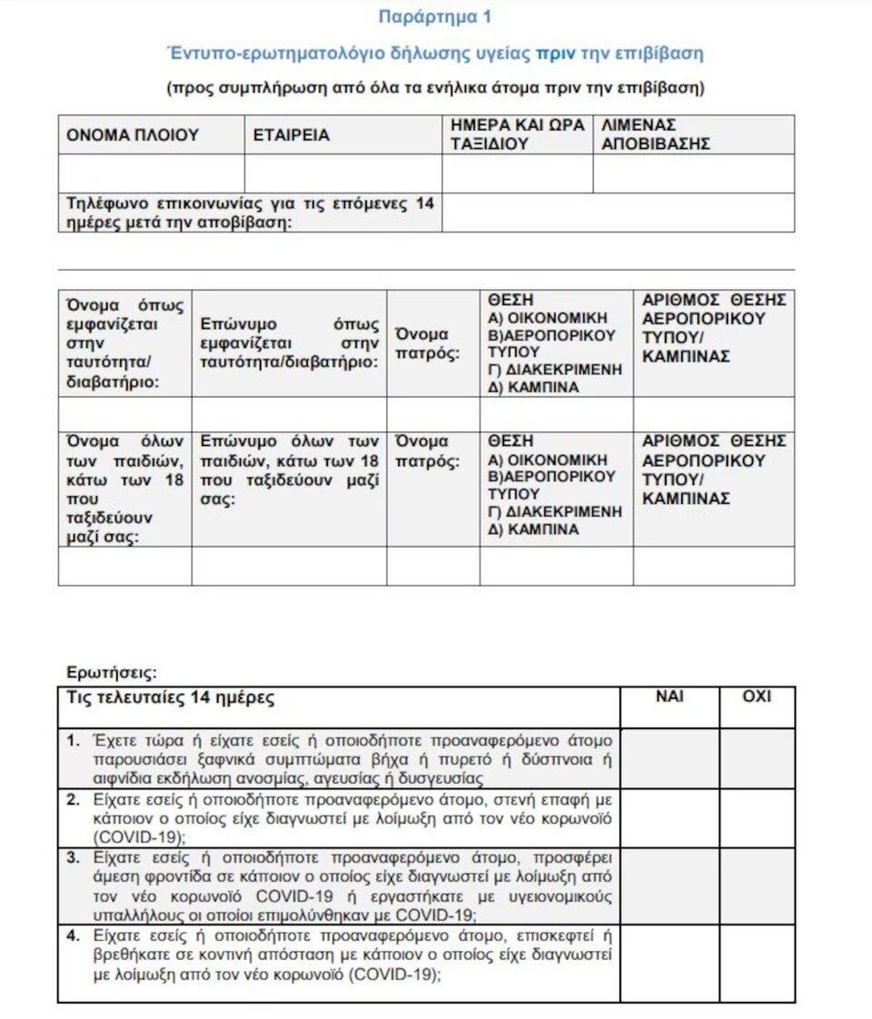 Ωστόσο, όλοι οι ταξιδιώτες που επιλέγουν το πλοίο για τις μετακινήσεις τους αυτή την περίοδο, οφείλουν να έχουν το αναθεωρημένο έγγραφο, με την επωνυμία «Δήλωση Υγείας Επιβατών», το οποίο έδωσε στη δημοσιότητα το υπουργείο Ναυτιλίας και Νησιωτικής Πολιτικής.
