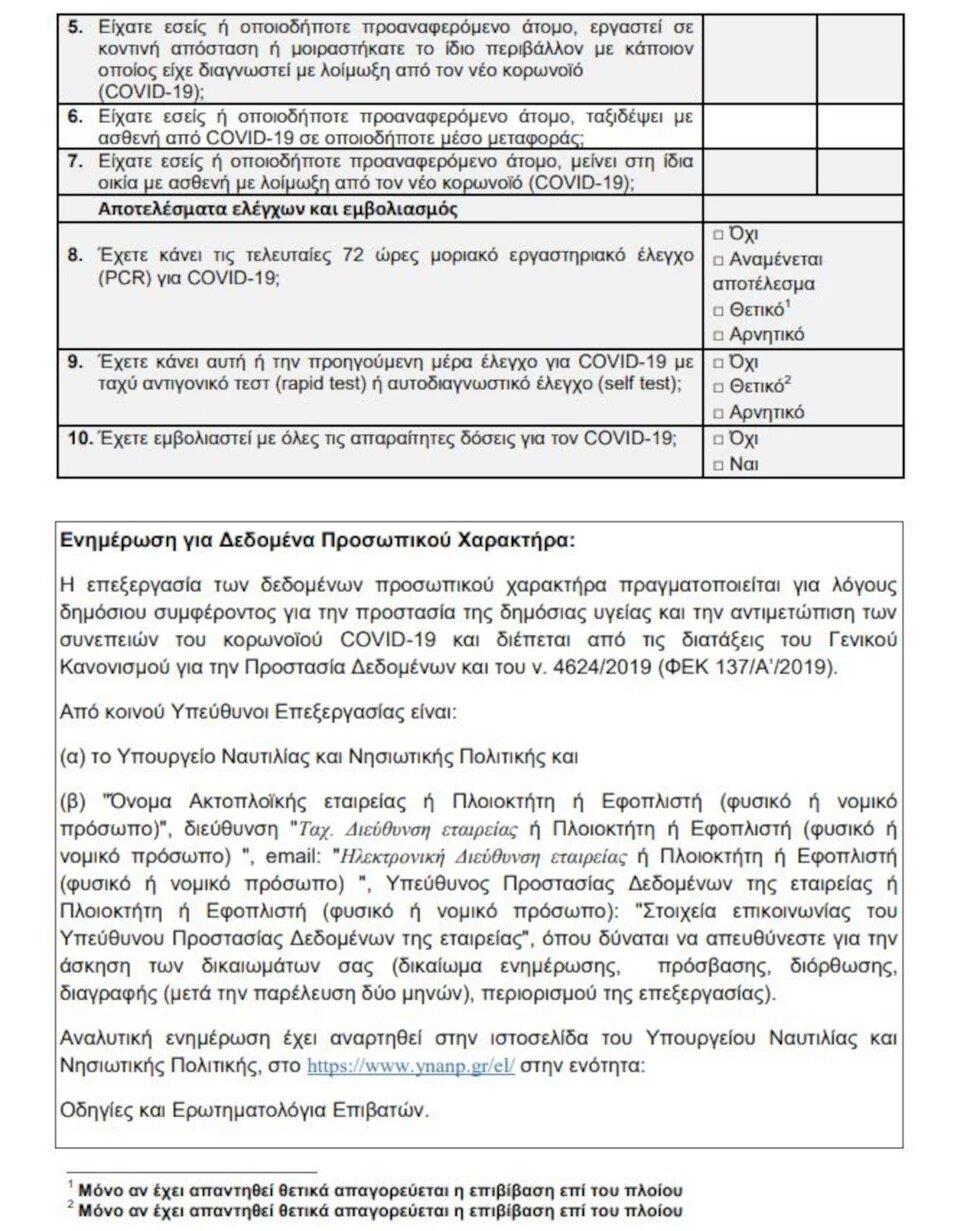 Όπως είναι φυσικό στο έγγραφο σημειώνουμε τα προσωπικά μας στοιχεία ενώ συμπληρώνουμε κι ένα ερωτηματολόγιο σχετικά με πιθανή επαφή μας με κρούσμα κορωνοϊού, ενώ απαντάμε και σε ερωτήσεις για τα τεστ αλλά και τα εμβόλια.