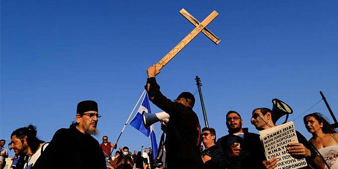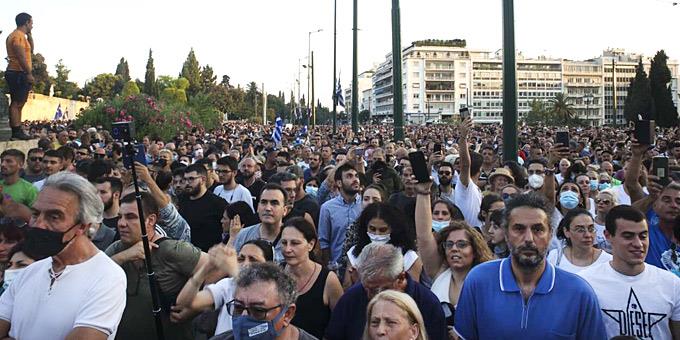 Ελληνικές σημαίες, σταυροί και πλακάτ γέμισαν την πλατεία Συντάγματος χθες Τετάρτη, σε μια διαδήλωση παραλογισμού διαμαρτυρίας κατά των εμβολιασμών.