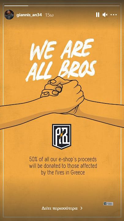 Τώρα, τα αδέρφια ανακοίνωσαν σε insta story πως το 50% των εσόδων από το e-shop τους, το «Antetokounbros Shop», θα διατεθούν σε όσους δοκιμάζονται από τις φωτιές.