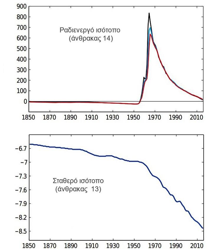 Όσο και αν είναι κουραστικό, είναι απαραίτητο να καταφύγουμε σε δύο ενδεικτικά διαγράμματα, απόσταγμα πολυετών ερευνών, που αναφέρονται στους τελευταίους αιώνες και βοηθούν να προσδιορίσουμε πότε άρχισε η κρίση του διοξειδίου του άνθρακα. Είναι η χειρότερη κλιματική απειλή με πιθανές βιολογικές επιπτώσεις, οδυνηρότερη και από την συνεπακόλουθη αύξηση θερμοκρασίας. Το πρώτο διάγραμμα προέρχεται από εργαστήρια καταγραφής πυρηνικών εκρήξεων και περιγράφει την εξέλιξη του ραδιενεργού άνθρακα 14 επάνω και του σταθερού ισοτόπου άνθρακα 13 κάτω. Ο ραδιενεργός άνθρακας αυξάνεται ξαφνικά περίπου από το 1960, και αυτό χωρίς αμφιβολία οφείλεται στις εκρήξεις πυρηνικών βομβών. Ταυτόχρονα όμως μειώνεται το σταθερό ισότοπο άνθρακας 13, στο κάτω διάγραμμα, και αυτό είναι η έκπληξη, γιατί αποδεικνύει αιφνίδια έναρξη έκλυσης διοξειδίου του άνθρακα στην ατμόσφαιρα, επιπρόσθετα από αυτό από τη καύση άνθρακα και πετρελαίου.
