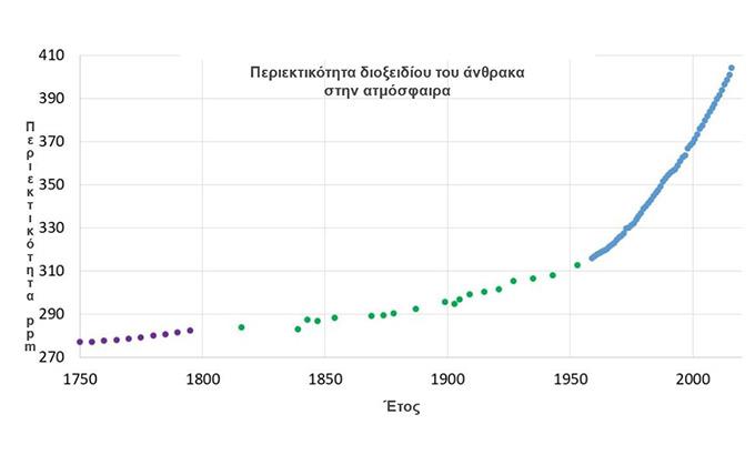 Το δεύτερο διάγραμμα, σε συνδυασμό με παλαιοκλιματικά δεδομένα αποτυπώνει εύγλωττα τη κλιματική κρίση της εποχής μας. Η περιεκτικότητα της ατμόσφαιρας σήμερα σε διοξείδιο του άνθρακα πλησιάζει τα 420 μέρη στο εκατομμύριο (ppm) από τα 280 ppm περίπου το 1800. Το πρόβλημα έχει δύο όψεις: οι απόλυτες τιμές είναι πολύ υψηλές και ξεπερνούν κάθε γεωλογικό προηγούμενο εδώ και ένα εκατομμύριο χρόνια. Επιπλέον, ο ρυθμός αύξησης είναι πενταπλάσιος από προηγούμενα γεωλογικά επεισόδια και αντικειμενικά μπορεί να χαρακτηριστεί ιλιγγιώδης, με απρόβλεπτες περιβαλλοντικές επιπτώσεις.