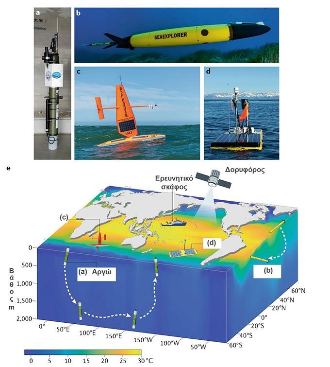 Τα δύο τελευταία χρόνια έχουμε για πρώτη φορά αξιόπιστες μετρήσεις στον Ανταρκτικό Ωκεανό, από την επιφάνεια μέχρι δύο χιλιόμετρα βάθος, χάρις σε ρομποτικές μετρήσεις σε συνδυασμό με δορυφορικές παρατηρήσεις. Στην Εικόνα φαίνεται διάταξη ρομποτικών καταγραφών με την υποστήριξη ερευνητικού σκάφους και δορυφόρων, μαζί με τα ρομποτικά καταγραφικά στη κορυφή. Πρόκειται για το διεθνές επιστημονικό πρόγραμμα «Αργώ» που καταγάφει κλιματικές παραμέτρους στους ωκεανούς και τα δεδομένα είναι ανοικτά στη διάθεση της επιστημονικής κοινότητας, και μάλιστα σε πραγματικό χρόνο.