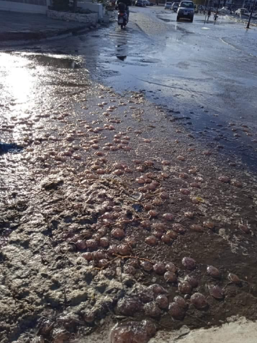 Τσούχτρες βγήκαν στη στεριά, σε περιπολία στους δρόμους της Άνδρου εξαιτίας των έντονων καιρικών συνθηκών.