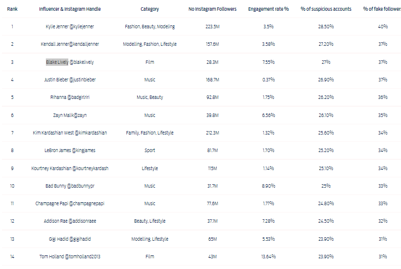 Στην πρώτη θέση βρίσκεται η τηλεοπτική σταρ Kylie Jenner με 40% ψεύτικους followers, ενώ ακολουθούν το μοντέλο Kendall Jenner (37%), ο τραγουδιστής Justin Bieber (37%) και η ηθοποιός Blake Lively (37%).