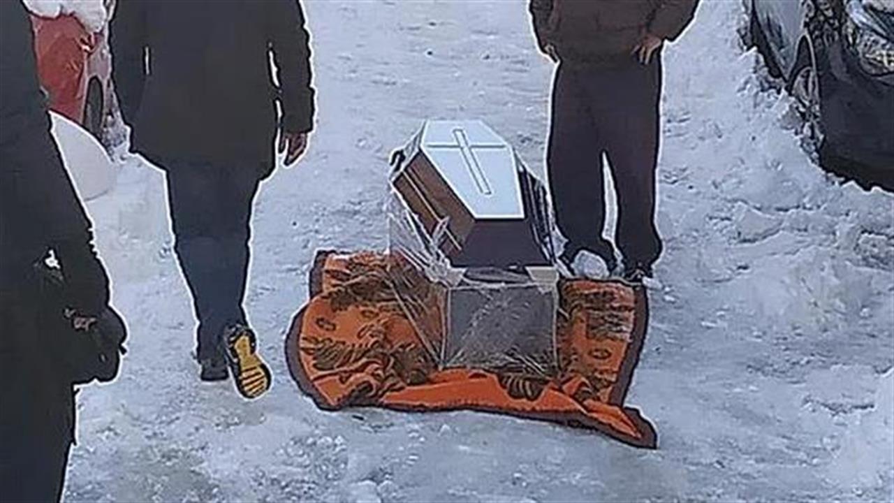 Στο βίντεο φαίνονται τρεις άνδρες, να σέρνουν το φέρετρο σε ένα στενό όπου το ύψος του χιονιού ξεπερνά τους 30 πόντους προκειμένου να το πάνε στη νεκροφόρα.