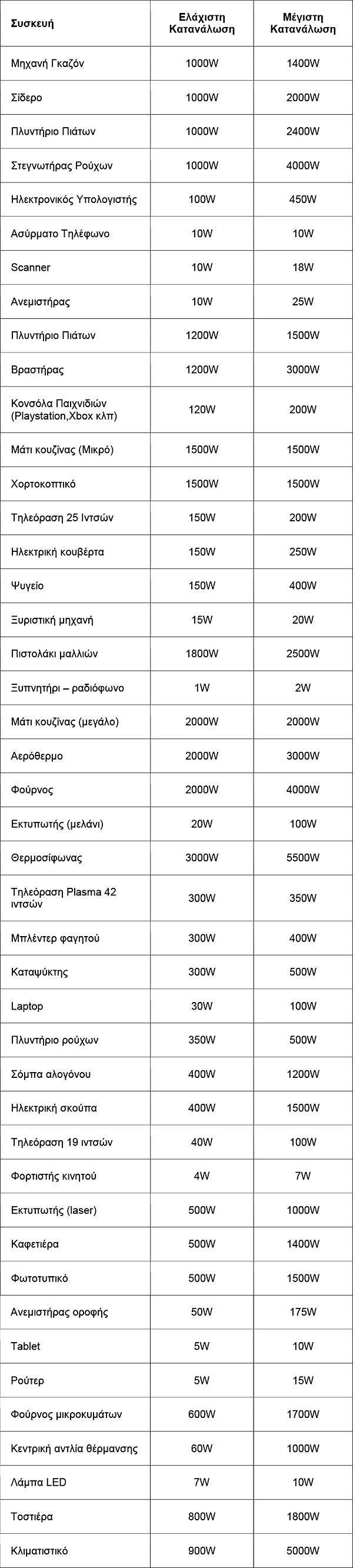 Δες παρακάτω έναν συνοπτικό πίνακα με την κατανάλωση ρεύματος κάθε οικιακής συσκευής: