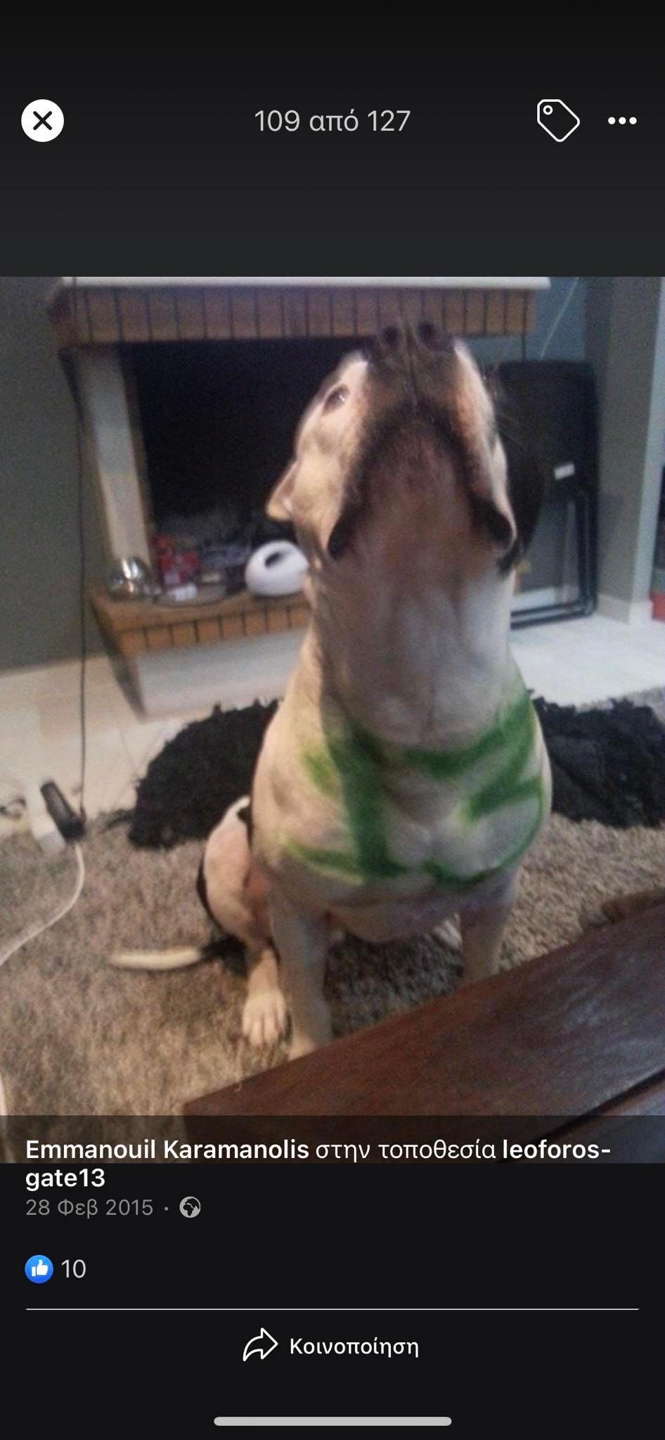 Όπως αποκαλύπτεται σε ανάρτηση της δημοσιογράφου και διευθύντριας της οργάνωσης Zero Stray Project, Σταματίνας Σταματάκου στο Facebook, σε φωτογραφίες που είχε ανεβάσει στο παρελθόν ο νεαρός, εμφανίζεται ο σκύλος του βαμμένος με τον αριθμό «13» με πράσινη μπογιά, πιθανών λόγω της αγάπης του για την ομάδα του Παναθηναϊκού.