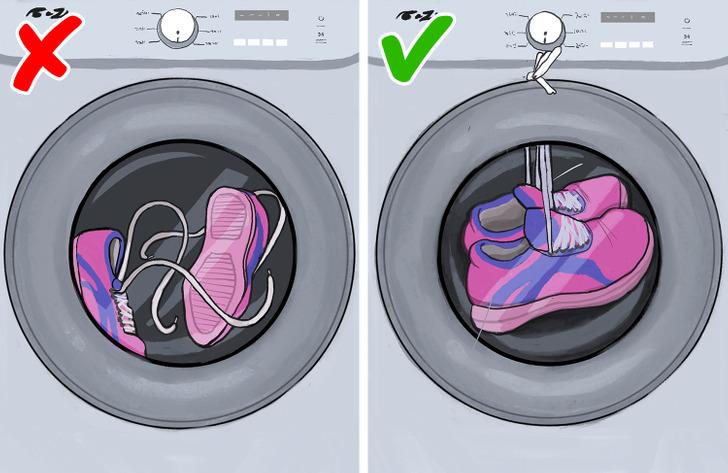 Δένοντας τα κορδόνια τους μεταξύ τους, και εν συνεχεία μαγκώνοντας την άκρη των κορδονιών στην πόρτα, όπως φαίνεται στην παραπάνω εικόνα. Έτσι αποφεύγεις να ταλαιπωρήσεις τόσο τα παπούτσια όσο και τον κάδο του πλυντηρίου σου.