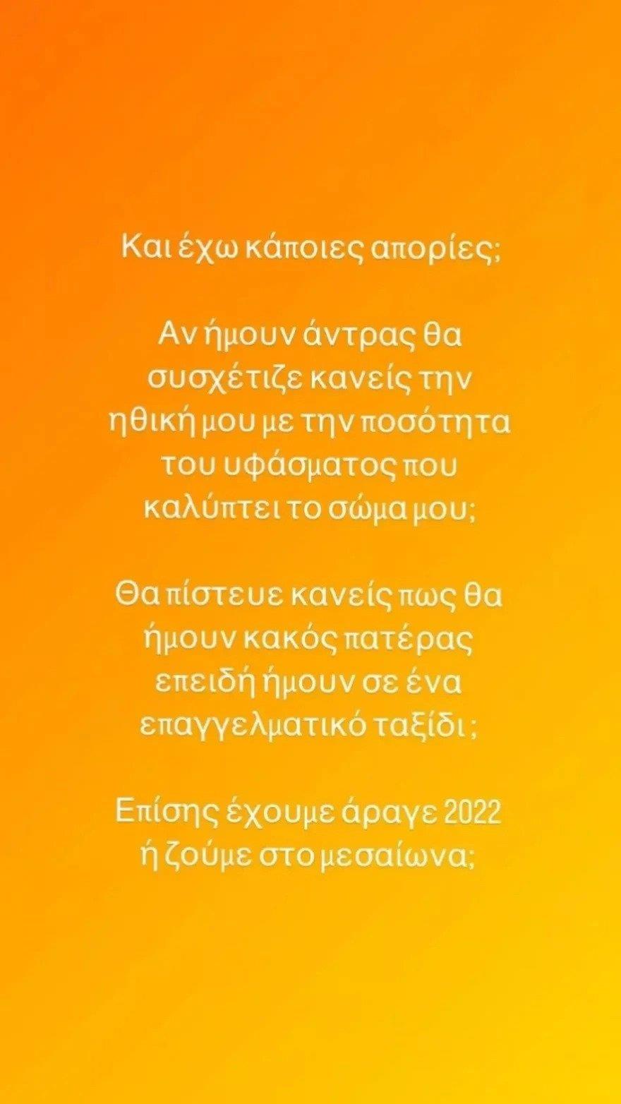 «Αν ήμουν άντρας θα συσχέτιζε κανείς την ηθική μου με την ποσότητα του υφάσματός που καλύπτει το σώμα μου; Θα πίστευε κανείς πως θα ήμουν κακός πατέρας επειδή ήμουν σε ένα επαγγελματικό ταξίδι; Επίσης έχουμε άραγε 2022 ή ζούμε στον μεσαίωνα;», έγραψε η Inluencer στο story της, το οποίο όπως ήταν αναμενόμενο ξεσήκωσε κύμα συμπαράστασης υπέρ της.