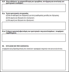 Δείτε το λήμμα ΙΙ.9 «Έχετε ερευνητικές συνεργασίες»; Αν κάποιος απλά απαντήσει ΝΑΙ, θα φταίει; Αν απαντήσει ναι/όχι σε κάθε μία από τις 3 περιπτώσεις; Τόσο δύσκολο είναι να ζητηθεί να αναφερθούν (αναλυτικά ή αριθμητικά) προκειμένου να υπάρχει κριτήριο αξιολόγησης, αφού προφανώς μόνο αυτό, δηλαδή η έρευνα, ενδιαφέρει την «Αρχή για την ποιότητα στην ανώτατη εκπαίδευση»;