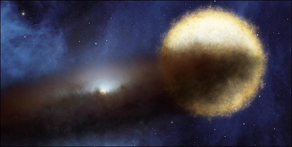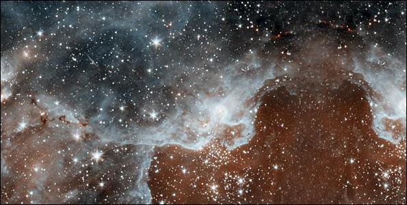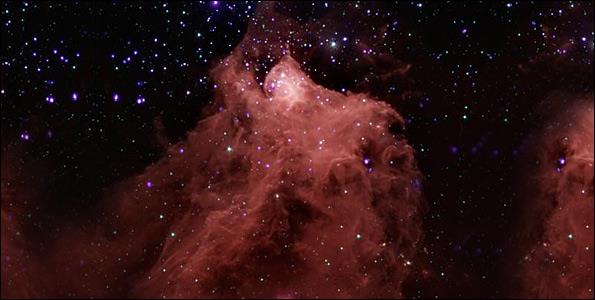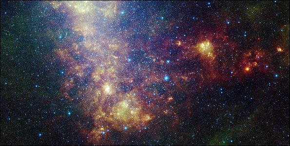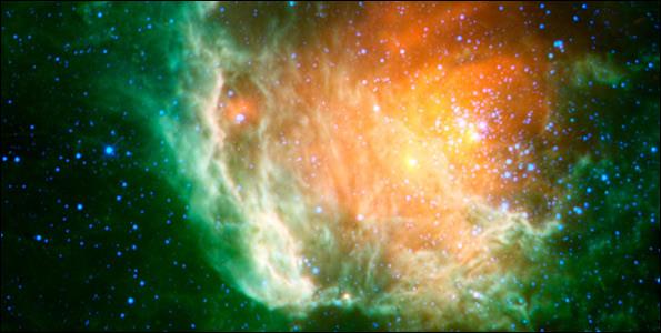 Το Spitzer κατόρθωσε να διεισδύσει μέσα από τα πυκνά νέφη και να ρίξει κλεφτές ματιές στη δημιουργία νέων άστρων. Οι μπλε περιοχές είναι σύννεφα σκόνης, ενώ οι πορτοκαλί αποτελούνται κυρίως από θερμά αέρια.