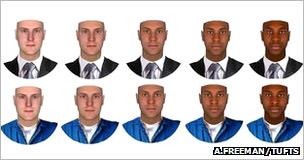 Όπως φαίνεται και στην φωτογραφία, ο τόνος του δέρματος των φωτογραφιών που χρησιμοποιήθηκαν ποικίλλει, έτσι ώστε να μην είναι πάντα ξεκάθαρο αν ο εικονιζόμενος είναι λευκός ή μαύρος. Πρόσωπα όπως αυτά που βρίσκονται στη μέση της φωτογραφίας, χαρακτηρίστηκαν κατά 61% «μαύροι» όταν φορούσαν κοστούμι και κατά 65% όταν φορούσαν φόρμα εργασίας.