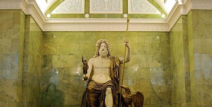 *Το Χρυσελεφάντινο Άγαλμα του Δία στην Ολυμπία Ο φημισμένος γλύπτης Φειδίας ανέλαβε να κατασκευάσει το 435π.Χ. ένα πελώριο άγαλμα προς τιμή του θεού που συνδεόταν στενά με την τέλεση των Ολυμπιακών Αγώνων. Κατά την ολυμπιακή εκεχειρία, κάθε πόλεμος σταματούσε, και από την Μικρά Ασία, την Συρία, την Αίγυπτο και την Σικελία, κατέφταναν προσκυνητές για να τιμήσουν το άγαλμα. Ο χρυσελεφάντινος «Ζευς» φτιάχτηκε τόσο ψηλός, ώστε να ακουμπά το ταβάνι του οικοδομήματος που τον φιλοξενούσε, και οι επισκέπτες να έχουν την εντύπωση πως αν σηκωνόταν, θα έσπαγε την οροφή. Τα σανδάλια και ο μανδύας του ήταν λαξευμένα από χρυσάφι και τα υπόλοιπα διακοσμητικά στοιχεία από τα πολυτιμότερα μέταλλα της αρχαιότητας. Επί αιώνες ήταν ένα από τα θεάματα που ο κάθε θνητός όφειλε να δει πριν πεθάνει, ενώ κατά την ρωμαϊκή περίοδο, ο αυτοκράτορας Καλιγούλας διέταξε να το μεταφέρουν στη Ρώμη και να αλλάξουν την όψη του ώστε να του μοιάζει, κάτι που δεν συνέβη ποτέ, γιατί το πλεούμενο που θα το μετέφερε το χτύπησε… κεραυνός και κάηκε πριν την φόρτωση. Το δώδεκα μέτρων άγαλμα καταστράφηκε τον 6° αιώνα μ.Χ. εξαιτίας μιας μεγάλης πυρκαγιάς.