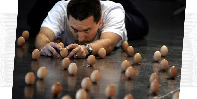 Το ρεκόρ των περισσότερων… όρθιων αβγών στον κόσμο ανέρχεται στα 420 αβγά. Εδώ, βλέπετε τον αμερικανό Biran Spotts στην Μελβούρνη το 2005, να επιχειρεί να το καταρρίψει, κάνοντας 439 ωά να ισορροπήσουν – χωρίς όμως επιτυχία.