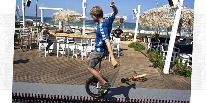 Ο Γερμανός Lutz Eichholz οδηγεί το μονόροδό του… πάνω σε μπουκάλια μπύρας, επιχειρώντας να σπάσει το ρεκόρ της πιο… ιδιαίτερης οδήγησης. Και τα καταφέρνει, διανύοντας μία απόσταση 8,93 μέτρων και 127 μπουκαλιών.