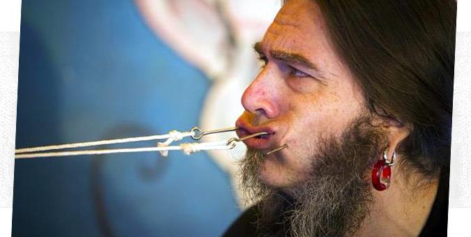 Ο εικονιζόμενος, με το παρατσούκλι Sweet Pepper Klopek συσπάται ολόκληρος καθώς καταφέρνει να σηκώσει ένα σφυρί 4,55 κιλών με σχοινιά που γάντζωσε στα μάγουλά του. Ελαφρώς (έως βαθέως) αποτρόπαιο, το συγκεκριμένο ρεκόρ καταγράφηκε στο βιβλίο Γκίνες στις 30 Οκτωβρίου του 2013, κατά την διάρκεια της Εθνικής Έκθεσης του Βανκούβερ.