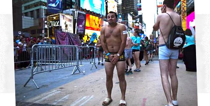 Ένας άνδρας ποζάρει με τα εσώρουχά του στην πλατεία Times της Νέας Υόρκης, κατά την διάρκεια συγκέντρωσης με σκοπό να σπάσει το προηγούμενο ρεκόρ των περισσότερων ανθρώπων που συγκεντρώθηκαν σε δημόσιο χώρο φορώντας μόνο το εσώρουχό τους, στο οποίο συμμετείχαν 2.270 άτομα.