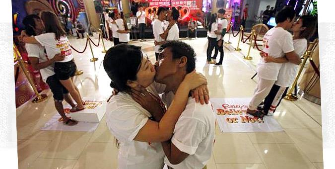 Πενήντα ώρες, είκοσι πέντε λεπτά και ένα δευτερόλεπτο είναι το ρεκόρ Γκίνες του μεγαλύτερου σε διάρκεια φιλιού όλων των εποχών. Το κατόρθωσε ένα ζευγάρι από την Ταϋλάνδη, ενώ στην παραπάνω φωτογραφία βλέπετε τον Ekkachai και την Laksana, οι οποίοι επιχείρησαν να το σπάσουν κατά την περσινή γιορτή του Αγίου Βαλεντίνου. Τα χείλη τους ενώθηκαν την Τρίτη 12 Φεβρουαρίου του 2013 και χώρισαν… την Πέμπτη.