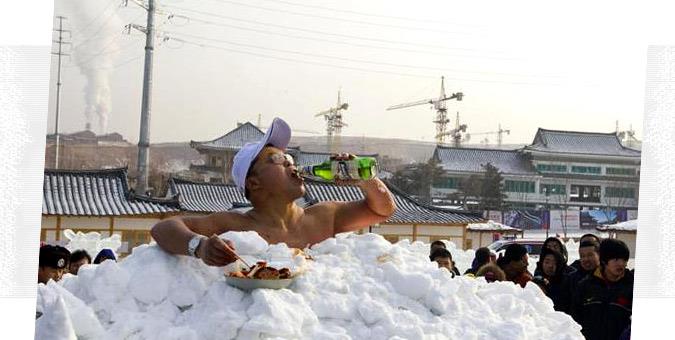 Ο Jin Songhao κάθεται αναπαυτικά μέσα στο χιόνι και απολαμβάνει την μπύρα και το τσιμπολόγημά του, όσο οι υπεύθυνοι του βιβλίου Γκίνες ετοιμάζουν την επόμενη καταχώρησή τους: Ο άνδρας από την επαρχία Jilin της Κίνας κατόρθωσε να μείνει γυμνός, σε απευθείας επαφή με το χιόνι επί 46 λεπτά, κάνοντας επίδειξη αντοχής στο κρύο.