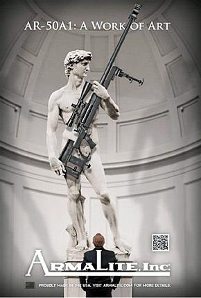 «AR-50A1: Ένα έργο Τέχνης», αναφέρει σε διαφημιστικό της πόστερ η αμερικάνικη εταιρεία εμπορίας όπλων Armalite και δείχνει τον Δαυίδ του Μικελάντζελο να κρατάει το συγκεκριμένο όπλο.