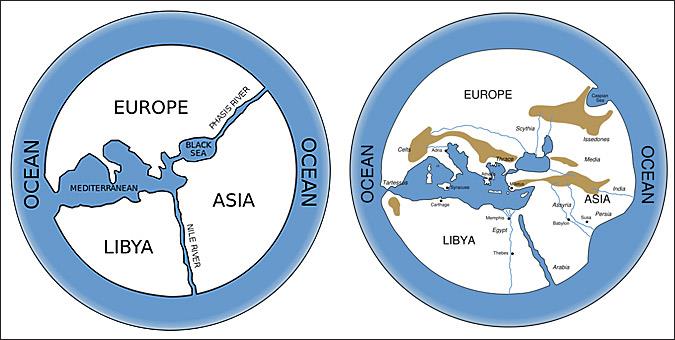 5ος και 4ος αιώνας π.Χ. Το πρώτο μέρος του παραπάνω χάρτη είναι δημιούργημα του Αναξίμανδρου, ο οποίος αποτύπωσε τον τότε γνωστό κόσμο σε κυκλική μορφή, θεωρώντας ως κέντρο του κόσμου το Αιγαίο πέλαγος. Όλος ο κόσμος, όπως θα καταλάβατε, περιβάλλεται από τον ωκεανό. Στον δεξιό χάρτη, από την άλλη, βλέπετε τον χάρτη του Εκαταίου του Μιλήσιου, ο οποίος βασίστηκε στα σχέδια του Αναξίμανδρου και σημείωσε πως το βορειότερο μέρος του κόσμου είναι η Σκυθία και το ανατολικότερο η Ασία.
