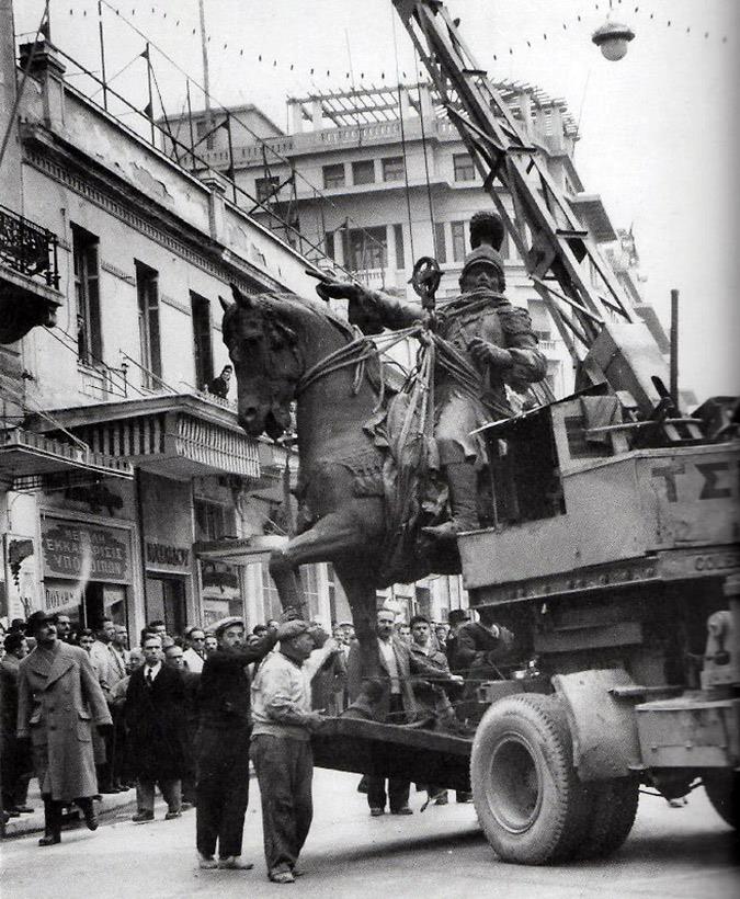 Η μεταφορά του ανδριάντα του Θεόδωρου Κολοκοτρώνη στην τωρινή του θέση, στον προαύλιο χώρο του μεγάρου της Παλαιάς Βουλής (φωτ. Πρακτορείου Ηνωμένων Φωτορεπόρτερ, 1954). Φωτογραφικό Αρχείο Εθνικού Ιστορικού Μουσείου.