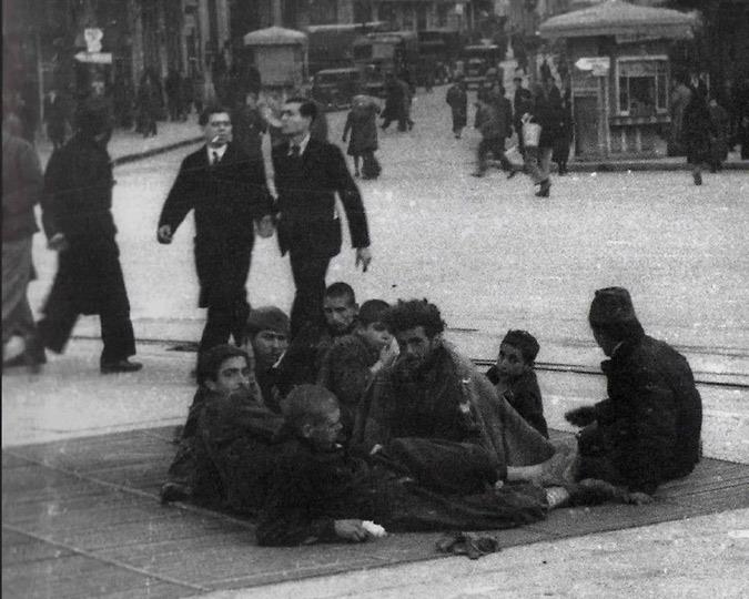 Αθήνα, Κατοχή. Άστεγοι προσπαθούν να ζεσταθούν καθισμένοι πάνω στη σχάρα εξαερισμού του σταθμού του ηλεκτρικού σιδηροδρόμου στην Ομόνοια. Φωτογραφία: Διεύθυνσις Εγκληματολογικών Υπηρεσιών της Αστυνομίας, 1941 – 1944. Φωτογραφικό Αρχείο Εθνικού Ιστορικού Μουσείου.