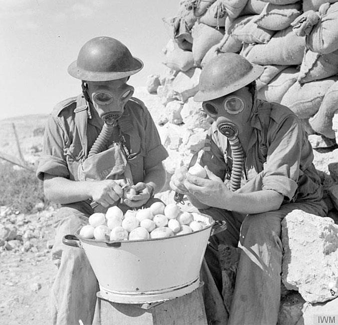 Στρατιώτες με μάσκες οξυγόνου καθαρίζουν κρεμμύδια στο Tobruk της Λιβύης, κατά τη διάρκεια του Β’ Παγκοσμίου Πολέμου. 15 Οκτωβρίου 1941