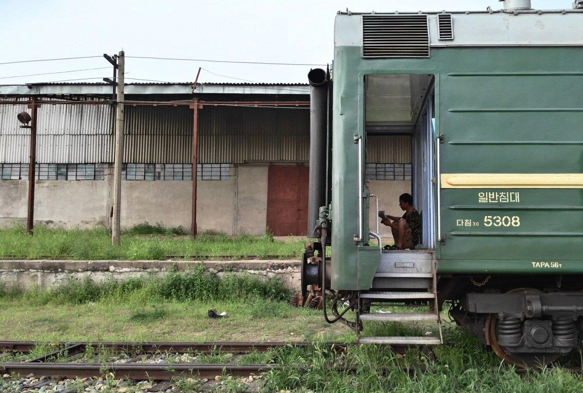 Μια αμαξοστοιχία σταθμεύει στον δρόμο της προς την πρωτεύουσα Pyongyang