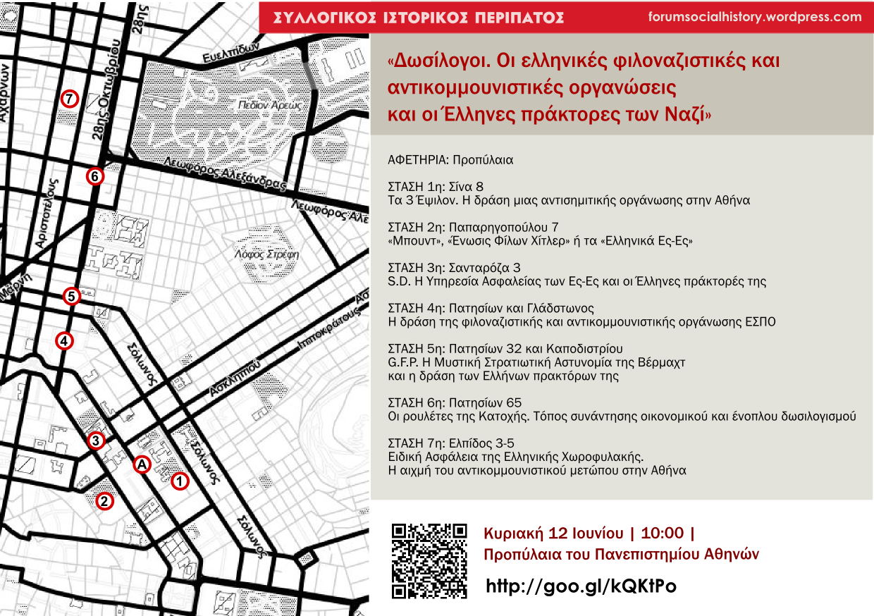 Ιστορικό περίπατο με γενικό άξονα την Αθήνα της Κατοχής και ειδικότερη θεματική τη δράση των Ελλήνων δωσιλόγων οργανώνει το Φόρουμ Κοινωνικής Ιστορίας την Κυριακή 12 Ιουνίου 2016.
