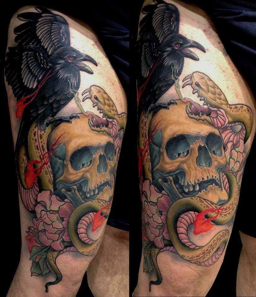 New Traditional νεκροκεφαλή και κοράκι από τον Gotza του DirtyRosesTattoo