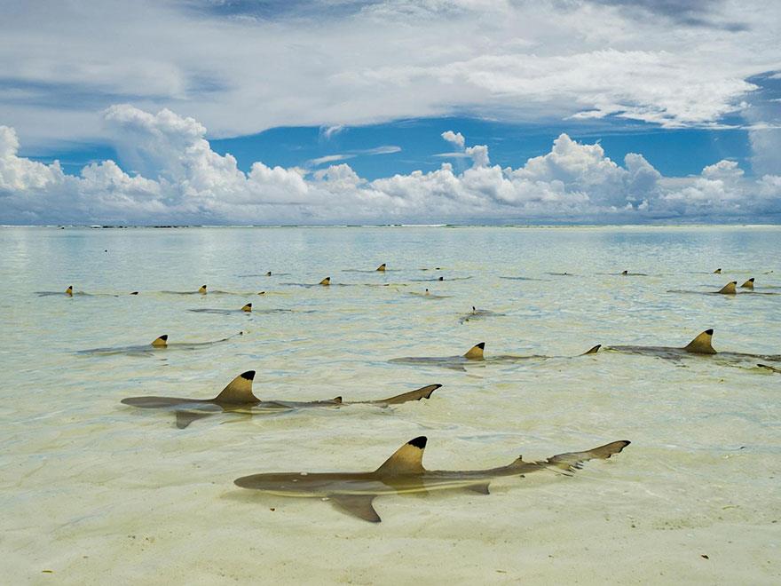 Καρχαρίες περιμένουν την παλίρροια να ξαναγεμίσει τη λιμνοθάλασσα στην ατόλη Aldabra των Σεϋχελλών.