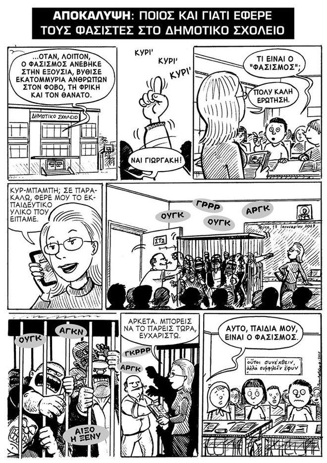 Χωρίς πολλά λόγια, αλλά με έξυπνη πένα, ο σκιτσογράφος John Antóno (Γιάννης Αντωνόπουλος) ανάλαβε να εξηγήσει μέσα σε λίγες εικόνες τι εστί φασισμός και τι εστί φασίστας.