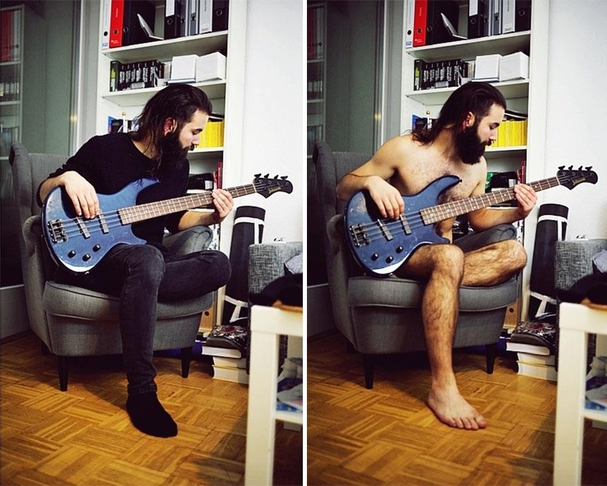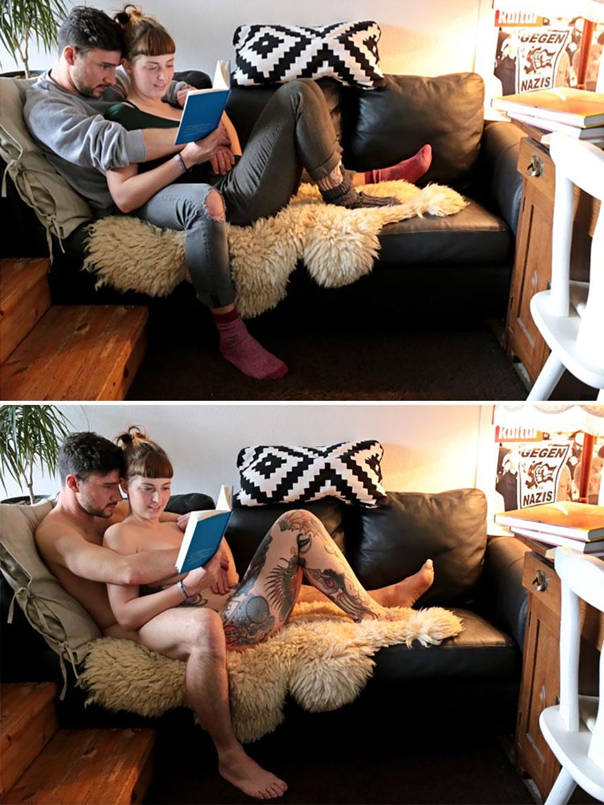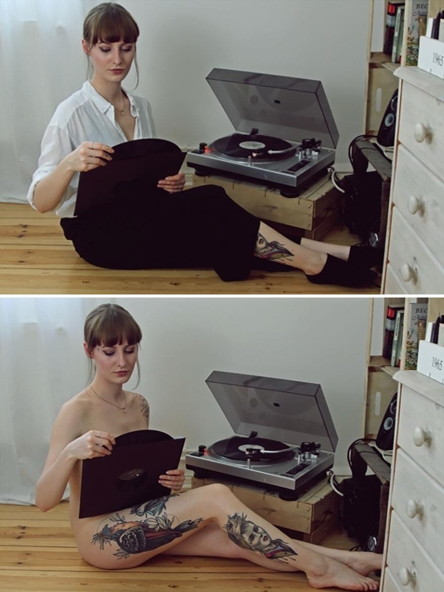 Η Sophia Vogel έχει ένα φωτογραφικό project, το “With and Without” (Με και Χωρίς) για τις ανάγκες του οποίου φωτογραφίζει τα «μοντέλα» της, καθημερινούς ανθρώπους της διπλανής πόρτας να παίζουν μουσική, να χαζεύουν στον υπολογιστή, να φροντίζουν τα κατοικίδιά τους και γενικότερα να κάνουν ό,τι τους αρέσει να κάνουν στο σπίτι τους, με ρούχα και χωρίς.