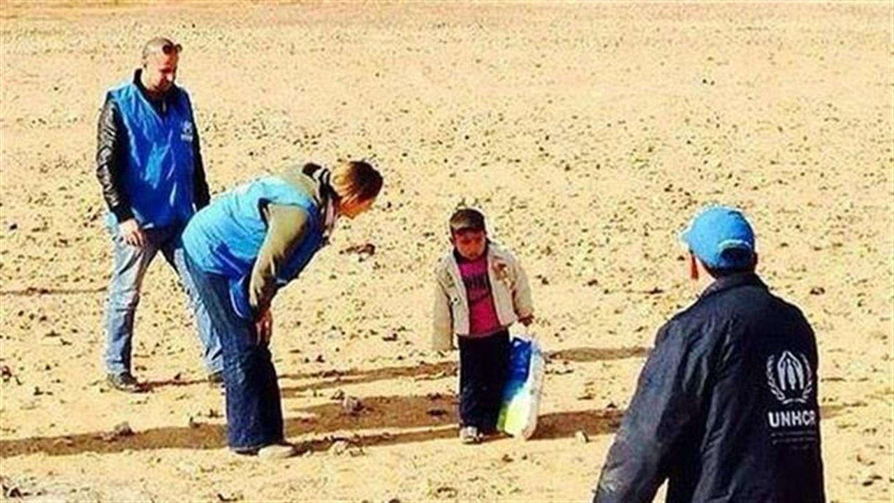 Ένα 4χρονο αγόρι, φαίνεται να περπατά στην έρημο όπου συναντά μέλη της Ύπατης Αρμοστείας του ΟΗΕ για τους πρόσφυγες, στα σύνορα Ιορδανίας Συρίας. Στο χέρι του κρατά μια σακούλα με ρούχα των γονιών του και δείχνει καταπονημένο από τις ώρες πορείας.