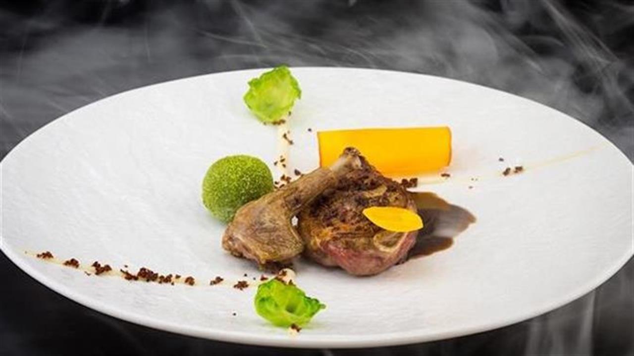 αρνί με chiffon φέτας, αγγούρι τουρσί ,σφουγγάρι ντομάτας και ελιές tartare