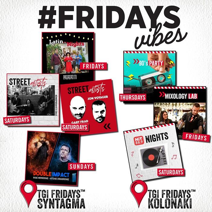 Πώς γίνεται κάθε μέρα να είναι Παρασκευή; Tα TGI Fridays™ πιστά στον σκοπό τους να μας χαρίζουν Fridays Vibes και feels ανεξαρτήτως ημέρας, δημιούργησαν μια σειρά από θεματικές βραδιές για όλο τον Οκτώβριο και τον Νοέμβριο στα καταστήματα TGI Fridays™ στο Κολωνάκι και στο Σύνταγμα. Live performances, stand-up comedy, interactive bartending και όχι μόνο, συνθέτουν την πιο cool ατζέντα της πόλης.