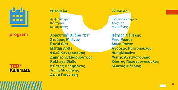 26 Ιουλίου - Αμφιθέατρο Κάστρου Καλαμάτας • Χορευτική Ομάδα 21 • Σταύρος Μπένος, Πρόεδρος, «Διάζωμα» • David Sim, Αρχιτέκτονας, Ρartner, Gelh Architects, Δανία • Martijn Arets, CEO και Ιδρυτής, Brand Expedition, Ολλανδία • Φιλιώ Κοντραφούρη, Δημοσιογράφος, CCTV Κίνα • Δημήτρης Σκαρμούτσος, Chef • Rokhaya Diallo, Ιδρύτρια & Πρόεδρος, Les Indivisibles, Γαλλία • Κώστας Περήφανος, Αναλυτής Δεδομένων/ Ειδικός Μηχανών Αναζήτησης, Pearson PLC • Άρης Μεσσήνης, Φωτογράφος, Γαλλικό Πρακτορείο Ειδήσεων (AFP) • Δώρα Γιαννίτση, Διευθύντρια, Κέντρο Ελληνικού Πολιτισμού Μόσχας